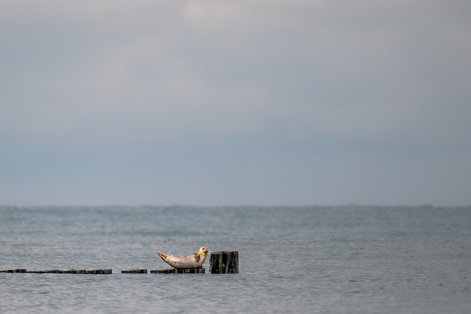 Ich bin also wieder einmal am Strand unterwegs und schaue - was ich ja immer mache - auf die Buhnen. Da sitzen die Kormorane und breiten ihre Flügel zum Trocknen aus. Eine Buhnenreihe haben sie freigelassen. Ich schaue genauer hin, und da sehe ich sie, eine Robbe, sie liegt da, wo sich sonst die Möwen und Kormorane aufreihen. Hat sich auf die Buhnen gewuchtet und genießt. Dabei hat sie mich fest im Blick - der Abstand scheint jedenfalls groß genug. Sie räkelt sich eher genüsslich und lässt mich fotografieren. Und weil es ihr anscheinend gut auf der Buhne gefällt, bleibt sie solange, bis ich ein Foto mit etwas Sonnenlicht machen kann. Danke dafür, Robbe!