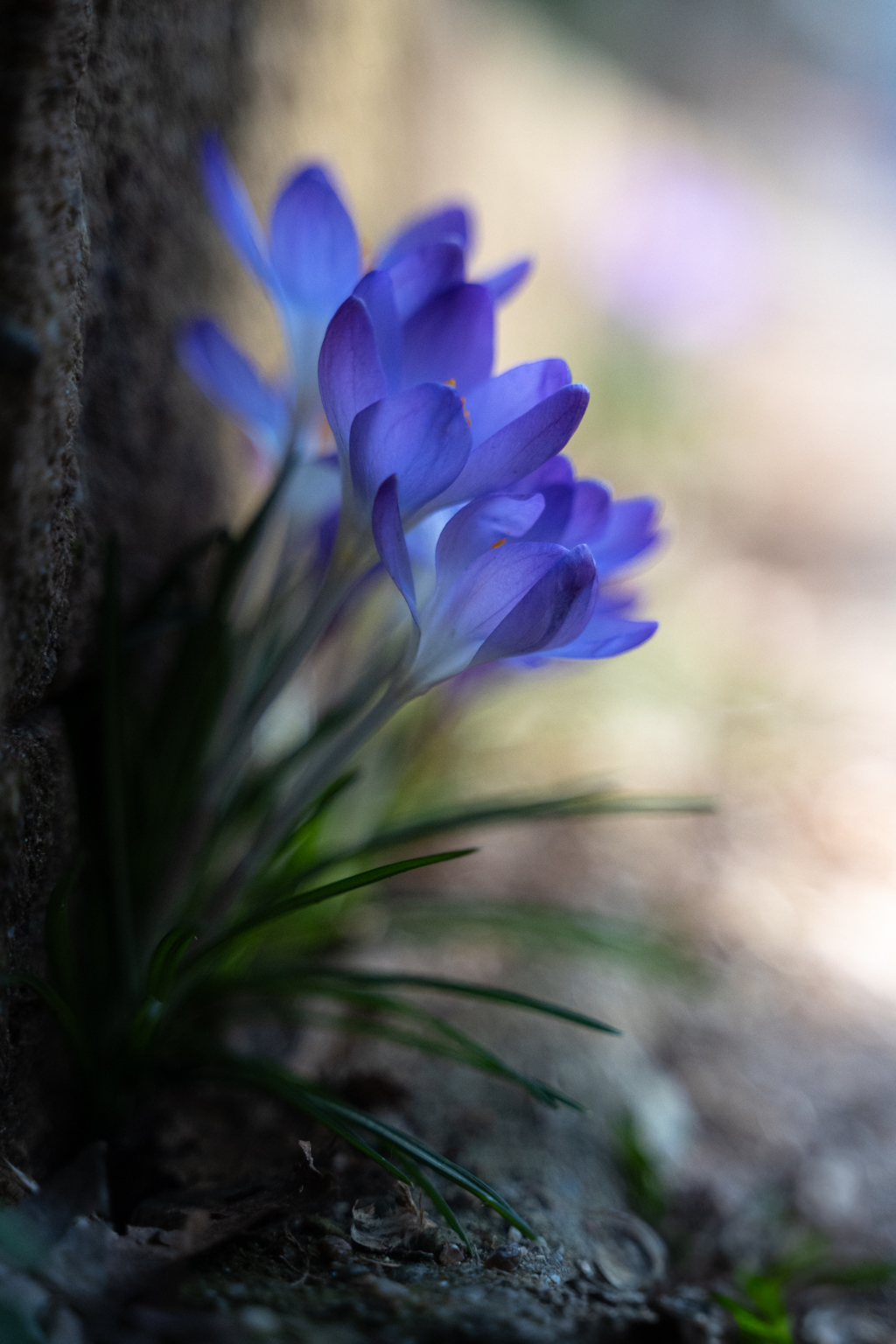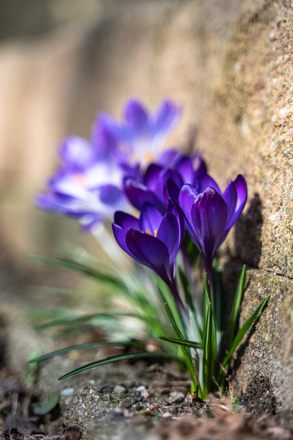 Auf einmal sind sie da, die ersten Frühlingsboten. Im Garten blüht der Haselstrauch, die Tulpen kündigen sich an und überall stehen sie, die kleinen bunten Farbkleckse - wilde Krokusse in hellem und dunklen blau. Im Wald, auf den Wiesen und - da war ich dann heute doch erstaunt - in einer Mauerkante am Rand des Gehwegs, ob noch im Schatten oder schon in der Sonne, recken sie sich dem Licht entgegen.
